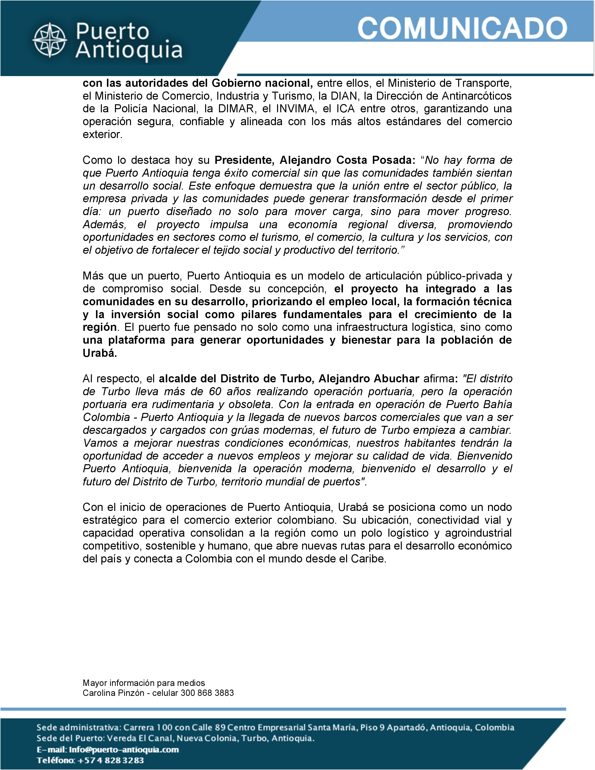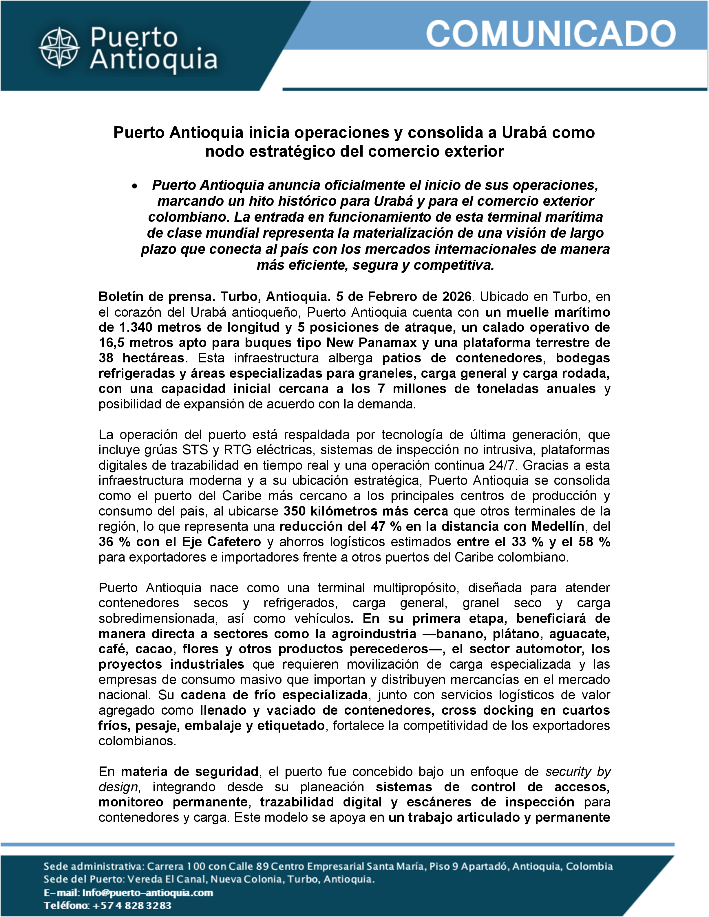 Puerto Antioquia inicia operaciones y consolida a Urabá como nodo estratégico del comercio exterior